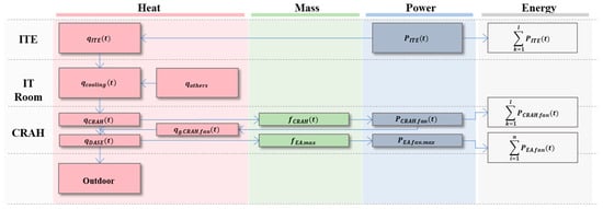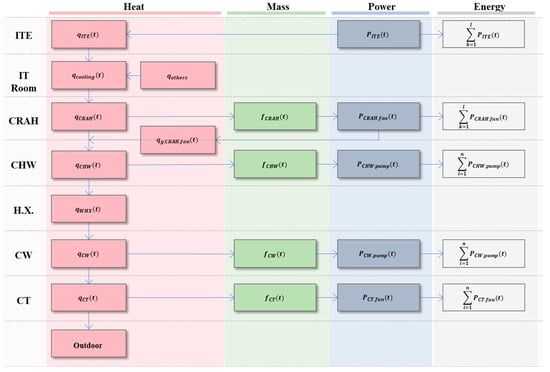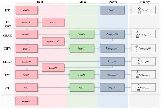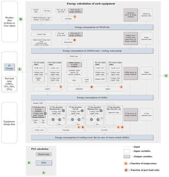 The power consumption of each cooling system component is not only influenced by its inherent capabilities but also by varying factors, such as the PLR and cooling medium temperatures. To address these fluctuations in the equipment performance, an equipment model was developed, which incorporated the calculated PLR and cooling-medium temperature conditions, achieved through heat and mass balance calculations, as depicted in Figure 5. To ensure precise power consumption calculations for the equipment, an algorithm from the EnergyPlus program [41] was adopted. The equations for calculating heat, mass, and equipment power at each time step are presented in Appendix A.