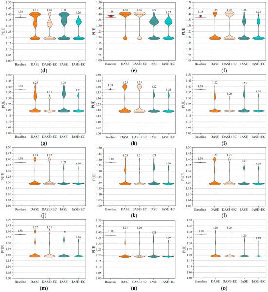 Uncertainties in average PUE according to climate zone and air-side economizer type: (a) 0A zone; (b) 0B zone; (c) 1A zone; (d) 1B zone; (e) 2A zone; (f) 3A zone; (g) 3B zone; (h) 4A zone; (i) 4B zone; (j) 5A zone; (k) 5B zone; (l) 6A zone; (m) 6B zone; (n) 7 zone; (o) 8 zone.