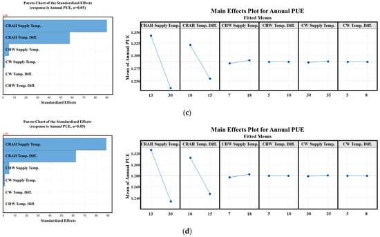 Pareto charts and factorial plots for annual PUE using economizers (DASE/IASE/WSE): (a) DASE; (b) DASE + EC; (c) IASE; (d) IASE + EC.