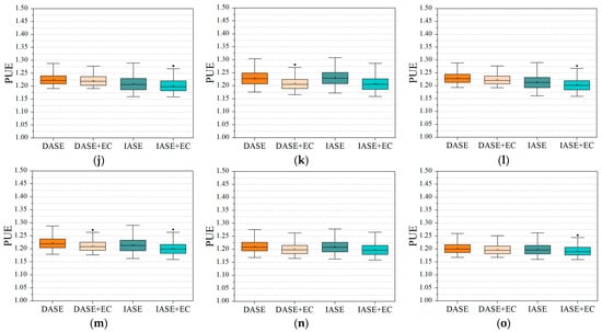For the DASE and DASE + EC systems, the PUE values of dry zones (1B, 3B, and 4B) exhibited a broader range of uncertainties than those in wet zones (1A, 2A, 3A, and 4A). Notably, this range extended further towards lower values, indicating a greater potential for reducing the PUE in dry zones by adjusting these two factors. For the IASE system, the differences in the PUE uncertainty between the dry and wet zones appeared to be similar. However, for climate zones 0A, 0B, 1A, 1B, and 2A, greater uncertainty was observed compared with that in the other zones, suggesting that variations in the CRAH supply temperature and the CRAH temperature difference have a more significant impact on the PUE in these regions. Consequently, careful consideration should be given to the design of these two factors when implementing IASE or IASE + EC systems in these zones. From region 6A onwards, the uncertainty in the annual PUE was similar across different economizer types. Adjusting the two influencing factors was estimated to lead to a further reduction in the PUE by approximately 0.08 to 0.12 in these zones.