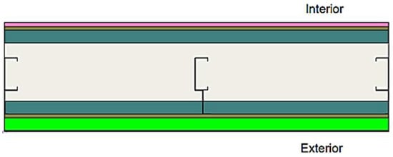 When a building element is formed by number of homogeneous layers, and the heat flow is perpendicular to the layers, the heat flow transfer is one-dimensional. In this instance, the total thermal resistance can be determined as shown in Equation (2), where is the internal surface resistance, is the external surface resistance, and is the thermal resistance of each homogeneous layer. According to ISO 6946 [], and can be considered as 0.13 and 0.04 , respectively.