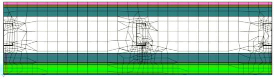 The internal and external surface temperatures were configured at 20 °C and 0 °C, respectively, in accordance with ISO 6946 []. This standard prescribes the internal and external film coefficients as 7.69 W/m2K and 25 W/m2K. The remaining boundaries were designated as adiabatic surfaces, ensuring no heat transfer. Similar boundary conditions have been employed in the thermal modelling of LGSPs and 3D-printed concrete structures [,,,]. For mesh control, the Quad Tree Mesh Parameter was set to 6, while the maximum number of iterations and the maximum allowable percentage of error in energy were both defined as 5 and 10%, respectively. Figure 2 shows the default meshed wall configuration as generated by the THERM 7.8 software [].