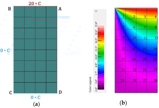 Test case 1 represents surface temperatures at 28 points of half of a square column (see Figure 3). It suggests using them for the validation of a model, with the difference between the temperatures suggested by ISO 10211 [] and the temperatures calculated by the numerical model using THERM 7.8 [] not exceeding 0.1 °C. Accordingly, half of a 400 mm × 200 mm square column was modelled using THERM 7.8 []. The boundary conditions were set to AB = 20 °C, BC = CD = 0 °C, and AD as adiabatic surface. The thermal conductivity of the material was set to 0.1 W/mK. The obtained temperatures at 28 nodes from the software analysis was compared with the temperatures given in ISO 10211 []. Table 1 shows the temperature comparisons. The comparisons indicated that the closest alignment between the results from the THERM 7.8 software [] and the ISO 10211 [] solutions was attained with less than 0.1 °C difference.