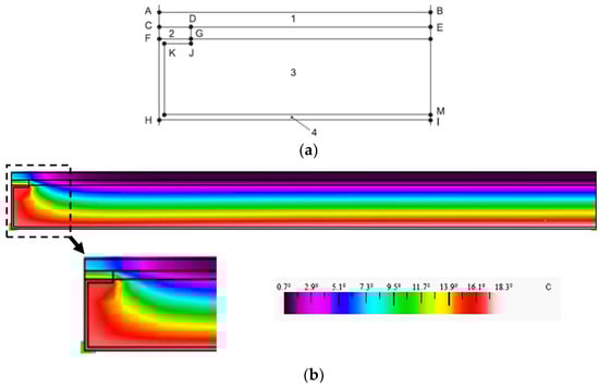As an additional method of validation, ISO 10211 [] recommends a different test case, which involves a wall section comprising layers filled with various materials, as depicted in Figure 4. The layers, numbered 1 to 4, were filled with concrete, wood, insulation, and aluminium, respectively. The thermal conductivities of each material are outlined in Table 2. Additionally, for each wall component denoted as AB, AC, CD, CF, EM, GJ, IM, and FG-KJ, the thickness measured 500, 6, 15, 5, 40, 1.5, 1.5, and 1.5 mm, respectively. Boundary conditions were established at 0 °C and 20 °C on surfaces AB and HI, respectively. Surface film coefficients for these surfaces were adopted as per ISO 10211 [] recommendations, set at 16.67 W/m2K and 9.09 W/m2K. The temperature profile obtained from the THERM 7.8 software [] is illustrated in Figure 4.