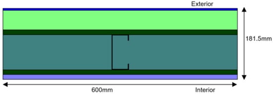 An interior wall was constructed with two 12.5 mm thick gypsum plasterboards on each side of the wall, a steel stud (C90 × 90 × 0.6), and a 90 mm thick cavity that was fully filled with mineral-wool batt insulation. This configuration was modelled as a reference interior wall, setting the total thickness of the wall at 140 mm, as illustrated in Figure 5. Steel studs were set in intervals of 600 mm. Thermal conductivity values as reported in Santos et al. [] were used for the modelling. The effects of fixing bolts (e.g., metallic self-drilling screws) were neglected in the simulation as their number was reduced, and the overall U-value was affected insignificantly, due to its reduced punctual thermal bridge effect.