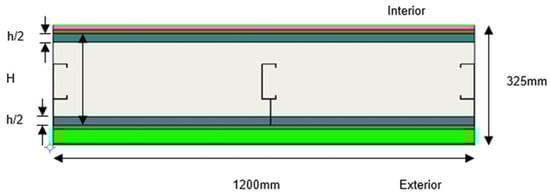 The thermal transmittance values (U-values) of LGSP walls were examined with two different wall configurations, each with varying total thicknesses: 275 mm and 325 mm. The schematic shape of the considered wall is illustrated in Figure 7. The impact of insulation material thickness was determined by varying it in relation to the h/H ratio, where “h” represents the thickness of the insulation material, and “H” denotes the total cavity width. The insulation materials included five different types: stone wool, mineral wool, rock wool, E-PLA, and fibreglass. The h/H ratio for both wall thicknesses (275 mm and 325 mm) varied for each wall and was set to 0, 0.2, 0.4, 0.6, 0.8, and 1. The outline of the parametric study is presented in Table 6.