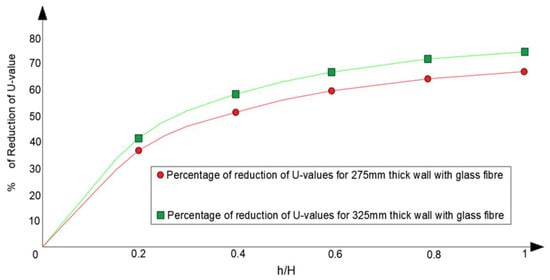 Comparison of U-value reduction against h/H ratio for both walls insulated with glass-fibre insulation.