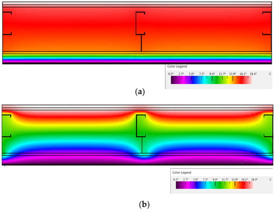 According to ISO 10211 [], temperature values derived from the validated method (i.e., THERM 7.8 [] in this study) should exhibit a difference of no more than 0.1 °C from ISO solutions. Table 3 compares the temperature solutions obtained from THERM 7.8 [] and given in ISO 10211 []. The comparison results demonstrate that the THERM software [] achieved the closest agreement with ISO temperature solutions, with a difference of less than 0.1 °C. Furthermore, the heat flow rate obtained from the model was 9.538 W/m, which closely aligned with the ISO 10211 [] recommendation of 9.5 W/m.