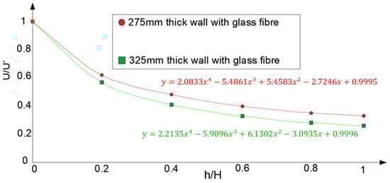 The U-value estimation according to the ISO design method [] for LGSPs with varying insulation ratios becomes complex due to inhomogeneous layer arrangements. Therefore, it is beneficial to propose equations to estimate the U-value based on the comprehensive parametric study results with different insulation ratios. To achieve this, a ratio (U/U’) was established where U’ represents the U-value obtained from the reference wall, which was the wall filled with air (no cavity insulation). Parametric results were graphed to identify potential correlations between the data. For instance, Figure 10 illustrates equations for walls insulated with glass-fibre material, featuring thicknesses of 275 mm and 325 mm. It is observed that there is a clear relationship between the insulation ratio (h/H) and U-values. A fourth-order polynomial equation was found to be a suitable representation of that correlation. These proposed simplified design approaches provide a more straightforward method for estimating U-values for LGSP walls, reducing complexity while maintaining accuracy. A similar design methodology was proposed in a previous study for 3D-printed concrete panels with varying insulation ratios [].