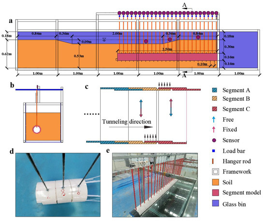 A shield tunnel is the most common method in the construction of urban subways, which has the advantages of high boring speed, high efficiency, and a short construction period. When a shield tunnel is exposed to uncertainty in the soil and complex geology, such as a river and geological faults, monitoring of the tunnel and surrounding soil is required to ensure project safety [1]. In the shield construction of underground tunnels, a single theoretical calculation or numerical simulation is not enough to guide the design of the project due to project size, incomplete prediction of soil characteristics, and complex construction conditions. However, model tests can reproduce engineering phenomena in the laboratory with scale models, which helps to solve this problem.