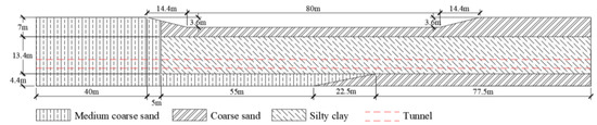 Figure 4 shows the distribution of soil layers in the actual project. From top to bottom, the strata within the tunnel area are coarse sand, silty clay, and medium coarse sand. The tunnel is located in the medium-coarse sand and silty clay layers. The actual soil layers are simplified in the model test, representing only the soil layer with large distribution areas. The mechanical properties of each soil layer are shown in Table 2.