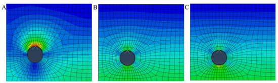 Soil stress distribution: (A) the pipe was fixed; (B) the hanger rod holding the pipe was loosened; and (C) pressure was applied to the tube.
