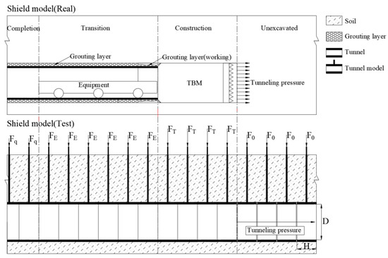 In the transition stage, the soil excavation and assembly of the segments were completed. In this stage, there were tunnel and shield appurtenances in the soil, so the load FE included the self-weight of the tunnel and the appurtenances. During the test, the appurtenant equipment length was about six times the length of a section tunnel model, and the load was determined according to Equation (4).