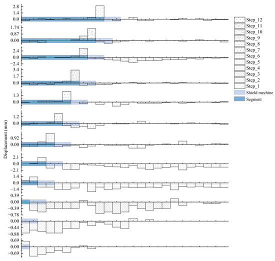 The final simulated length of the test was 25 “excavation units” (one “excavation unit” is the length of one section of the tunnel model), which is equivalent to the actual project excavation length of 100 m. Among them, 12 “excavation units” were used to study the impact of shield tunneling on soil and tunnels, and 13 “excavation units” were used to study the effect of water level changes on the shield. Only the first 12 “excavation units” are studied in this paper. As shown in Figure 7, the 12 bars represent the tunnel model displacements at different boring positions. In each stage, the shield advances one “excavation unit”. The purple rectangle is the shield model, which has a length of two “excavation units”. The tunnel model in front of the shield is soil, and the tunnel model behind the shield (green rectangle) is the completed tunnel.