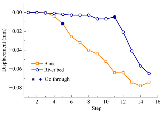 The results of the ground displacement meter show that the shield causes substantial settlement of the ground surface above the shield machine (Figure 8). In this case, the surface settlement rate of the riverbed is greater than that of the riverbank, which differs by a factor of 3. However, the final settlement of the riverbed and riverbank is close, with a maximum settlement of 0.0780 mm on the riverbank and 0.0648 mm on the riverbed. With a similar ratio of 40:1, the maximum settlement on the riverbank becomes 3.120 mm, and the maximum settlement on the riverbed is 2.592 mm. Since the test is not a strict proportional test, the ground settlement results can only be used for qualitative analysis, and the quantitative analysis is for reference only.