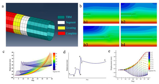 The “birth and death” method was applied to simulate tunnel construction, and the heating method was used to simulate the grouting process of the grout layer. The FEA model is 50 m wide, 70 m deep, and 120 m long, and the inner diameter of the tunnel tube piece is 5.5 m, the outer diameter of the tunnel tube piece is 6 m, and the outer diameter of the shield machine is 6.28 m. As shown in Figure 9a, the shield model, tail segment, and grout layer are activated during the simulated excavation. The shield tail gap is simulated by the gap between the tunnel and the surrounding ground. A thermal load is applied to the grout layer, which expands under temperature and grouting pressure applied to the tunnel segment and surrounding soil. The grouting pressure is related to the modulus of elasticity of the grout, temperature, and coefficient of thermal expansion. The parameters were adjusted to achieve the required grouting pressure. The Mohr–Coulomb (MC) model was used for the soil constitutive relations, in which the MC model is the most prevalent constitutive relation in tunnel simulation [20,21,22], especially for soil consisting of coarse sand, medium-coarse sand, and silty clay. So, the use of the MC model is reasonable [23].