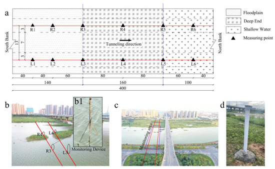 To enhance the credibility of the test, on-site measurements were conducted at the Xi’an Metro Phase 3 project. The construction project utilized an SPB (Slurry Pressure Balance Shield) to excavate and advance from the south bank of the Weihe River toward the north bank. The site has relatively open surroundings, with a double-pier supported road bridge located above one side of the tunnel (Figure 10c). The total length of the tunnel is about 600 m. There were two lines: the left line and the right line. Monitoring was started from the southwest Weihe River along the direction of the shield tunnel. The total length of monitoring was 400 m: 140 m was river diffuse, 160 m was deep water, and 100 m was shallow water (Figure 10a). Monitoring points were placed along the tunnel axis (Figure 10d), with six points positioned above the right tunnel and six points above the left tunnel, where the right line was the first tunnel (Figure 10b).