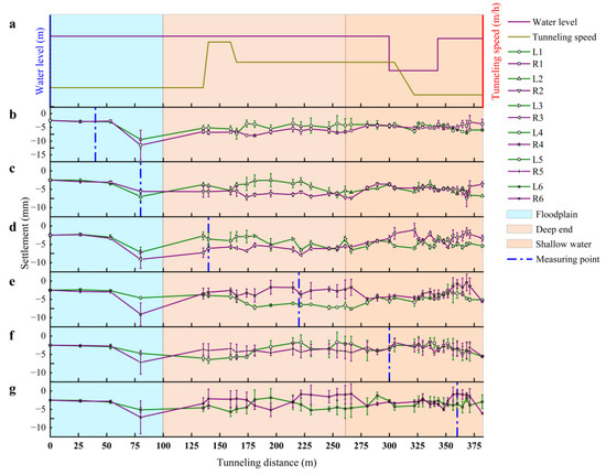 By analyzing the relationship between the left and right lines, it is observed that during the shield tunnel crossing of floodplains and shallow water, there is a minimal disparity in the settlement of measurement points on both sides. When the shield tunnel crosses the deep water, a significant difference in settlement is shown between the measurement points on the left and right lines. The analysis indicates that a shield tunnel traversing deep water causes more significant settlement and wider influence on the surrounding area.