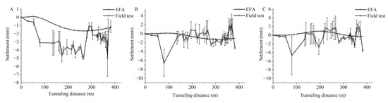 It is worth noting that the measured data were irregular and subjected to significant disturbances. This is because the settlement markers were disturbed by weather and rivers, thus resulting in difficulty in measuring the precision of the settlement changes. The field test cannot measure the displacement of the tunnel and soil body located underground.