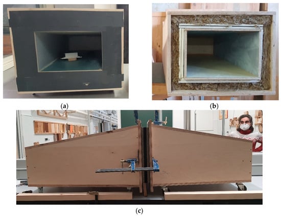 The box was made of two volumes of different geometry, size, and volume. Figure 1 shows the final dimensions and detailed test setup. The multilayer composition of the box’s walls was, from inside to outside, as follows: plywood board with HPL laminate (15 mm), high-density plasterboard (2 × 13.5 mm), rock wool (60 mm), and plywood board (22 mm).