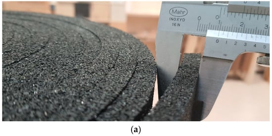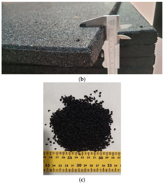 The GTR material was selected based on results from previous studies [134,135]. Table 4 summarizes the different formats of GTR used in the different stages of the study. As shown in Figure 4, all the material was provided by BERLÁ (Valladolid, Spain) in 4 different formats: rolls (6 mm and 10 mm), sheets (22 mm), and granules (2.5–4 mm).