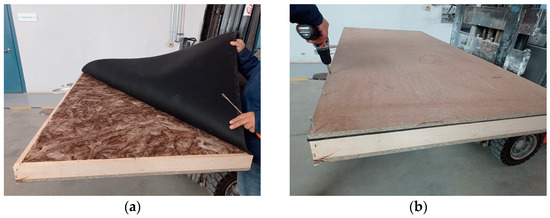As can be seen in Figure 2a, the opening was covered with an elastomeric material to avoid rigid connection between the samples and each side of the box. In Figure 2c, one can observe how both volumes were mechanically adjusted by placing the sample under study between them. The test box was standing on rubber wheels, with the aim of isolating it from possible external vibrations.