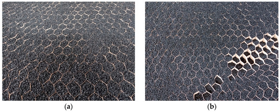 When the samples included GTR in its granulated form, a paper-based honeycomb structure was used as a supporting structure (see Figure 5c). The height was 25 mm; thus, any sample including the granulated GTR included the code G4 (25). The corresponding surface mass of the GTR layers (once built in the panels) was 5.8 kg m−2 for GTR6; 7.8 kg m−2 for GTR10; 19.8 kg m−2 for GTR22; and approximately 15 kg m−2 for the G4 (25) granulated solution.