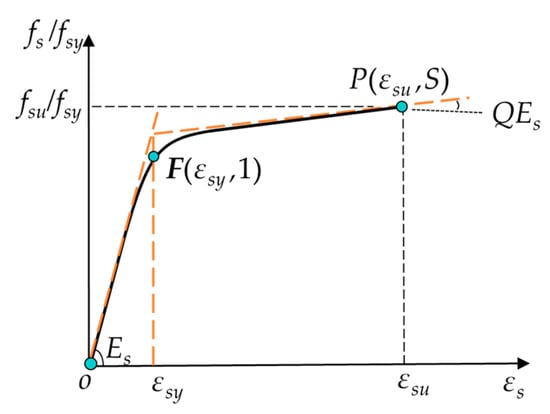 where Q is the strain-hardening coefficient; the exponent N mainly controls the roundness of the yield stage; εsy is the nominal yield strain; εsu is the ultimate strain corresponding to the ultimate tensile strength fsu.