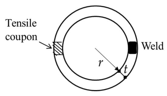 A comprehensive collection of 74 experimental results from the available literature is assembled. Figure 2 displays the labels assigned to the tensile coupon, while specimens from the weld area are excluded from the analysis. Additionally, specimens failing to meet the ductility requirements of the specifications are also eliminated. A summary of the variables of specimens as well as necessary experimental results is provided in Table 1, where fsy,0 and fsy are the yield strengths of the same material before and after cold-rolling, respectively. Additionally, fsu represents the ultimate tensile strength of cold-formed CHS steel specimens. For convenience, based on the parent steel, coupons with fsy,0 exceeding 460 MPa are considered high-strength steels []. As shown in Table 1, the range of fsy,0 is from 400 MPa to 1400 MPa, corresponding to the thickness t of steel sheets varying from 1.5 mm to 10 mm, while the yield strength improves from 357 MPa to 1402 MPa for cold-formed CHSs with a r/t ratio of 6~32.