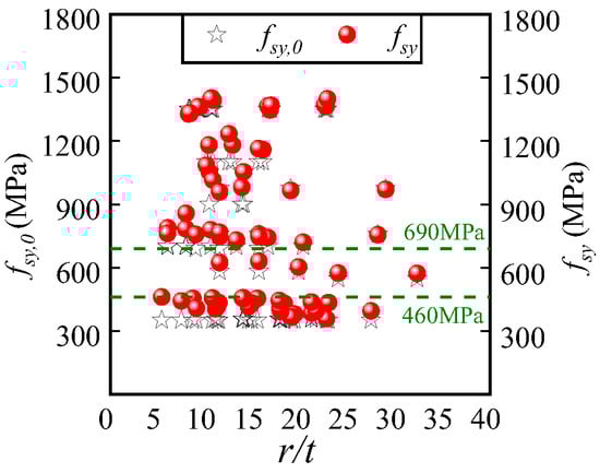 The red trend line in Figure 5b shows that the relationship between fsy,0 and fsy exhibits a strong linear correlation. The difference between fsy and fsy,0 decreases and even disappears with the increase of fsy,0, and the results is also confirmed by previous research [], the relevant experimental data of which is highlighted in green dots in Figure 5b. Furthermore, if setting the fsy/fsy,0 ratio to 1.0, it can be obtained that the value of fsy is 1748 MPa, and the value suggests that the influence of material strength on the cold-rolling effect has an upper limit. Based on the results shown above, a more physically meaningful way of determining fsy can be obtained, as shown in Equation (2). When fsy,0 exceeds 1748 MPa, the value of fsy can be considered consistent with fsy,0.
