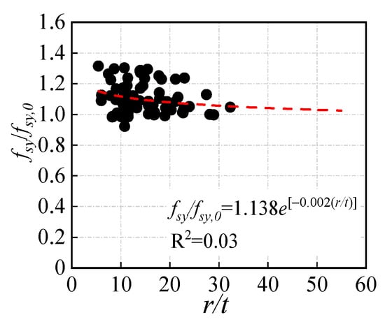 Based on the collected data of Table 1, Figure 4 presents the relationship between the measured yield strength fsy and the r/t ratio, and fsy has been normalized by the measured fsy,0. According to the trend line of the red dotted line shown in Figure 4, it can be found that the fsy/fsy,0 ratio decreases with the r/t ratio increasing, and the cold-rolling effect seems to disappear when the value of the r/t ratio reaches 60 based on the trend line of Figure 4.