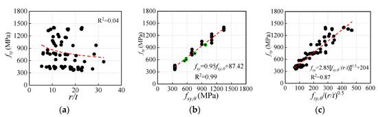 The yield strength of the cold-formed CHS steels differs from that of the parent material. To examine the influence of the cold-rolling effect, a sensitivity analysis is conducted on the r/t ratio and the yield strengths fsy,0 and fsy. By comparing the relationship between fsy and three different physical quantities shown in Figure 5, it can be found that the independent r/t is different in establishing connections with fsy, while the compound parameter fsy,0/(r/t)0.5 exhibits a better correlation with fsy as the R2 reaches 0.87. The optimal group is the relationship between fsy,0 and fsy because the measured fsy has the strongest correlation with fsy,0, which can be expressed by a linear function.