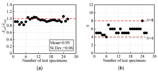 The curvature coefficient N is the critical roundness variable at the yield stages of the stress-strain curve. In this section, the analytical curve is required to pass through the coordinate origin and the point (εsu, fsu) shown in Figure 1. The ideal value of N is evaluated based on two criteria: (1) the envelope area ratio of the calculated results Acal to the experimental results Aexp (corresponding to Figure 6a), and (2) the coincidence degree of the transition curvature in the elastic-plastic stage (corresponding to Figure 6b). Through debugging and analysis, as shown in Figure 6, the empirical values of N are almost in the range of 4 to 8.