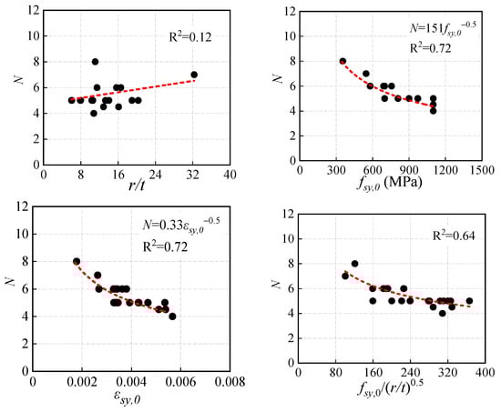 The relationships between the curvature coefficient N and the main variables are shown in Figure 7. It is clear that the r/t ratio and the combined parameter fsy,0/(r/t)0.5 are not the primary factors affecting the curvature coefficient N, while fsy,0 and the corresponding strain εsy,0 have the same correlation coefficient relationship with N. Considering the influence of the elastic modulus Es of tensile coupons, εsy,0 is chosen to be the primary factor, and Equation (3) is proposed to calculate the curvature coefficient N.