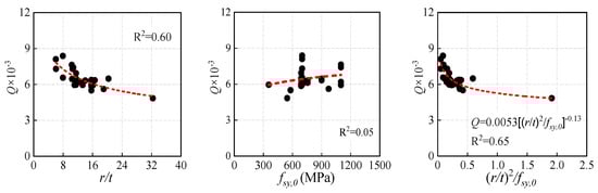 The strain-hardening exponent Q characterizes the strain-hardening behavior of the strengthening segment. The value of Q can be determined by defining two points (εsy, fsy) and (εsu, fsu), as shown in Figure 1. To identify the critical factor for Q, the relationships between the measured Q and the main variables are shown in Figure 8. It can be concluded that the correlation coefficient R2 between the combination parameter (r/t)2/fsy,0 and Q is 0.65, which is higher than that of the other variables. Therefore, the strain-hardening coefficient Q can be calculated using Equation (4).