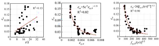 The relationships between the ultimate strain εsu and the main variables are shown in Figure 9. There is no obvious relationship between the measured ultimate strain εsu,cal, and the r/t ratio. The correlation coefficient between εsu and the εsy,0 is 0.82. It can be observed that the ultimate strain εsu shows a stronger correlation with the combined parameter fsy,0/(r/t)0.5 compared with εsy,0, whose correlation coefficient is 0.9.