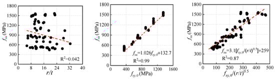 Figure 10 shows the relationship between ultimate tensile strength fsu and three main factors. There is no obvious relationship between the r/t ratio and fsu. The correlation coefficient between fsu and the combined parameter is 0.87, while the strongest correlation can be observed between fsy,0 and fsu with a correlation coefficient as high as 0.99, which implies an extremely strong linear correlation.