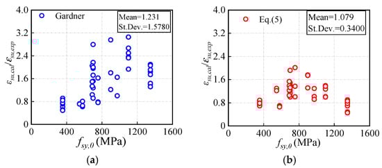 Comparison between the measured and calculated ultimate strain εsu. (a) Available method raised by Gardner. (b) Proposed method in the paper