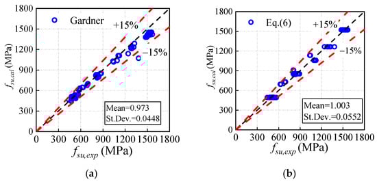 Secondly, the comparison between the experimental ultimate tensile strength fsu,exp (from 74 test groups) and the calculated results fsu,cal (obtained using Equation (6)) is conducted, as illustrated in Figure 12. The predictive expression of ultimate strength fsu proposed by Gardner is also plotted in the figure. Both expressions proposed demonstrate relatively high accuracy in predicting the ultimate tensile strength with errors of approximately 15%, while Equation (6) proposed by the authors is better suited for high-strength steels.