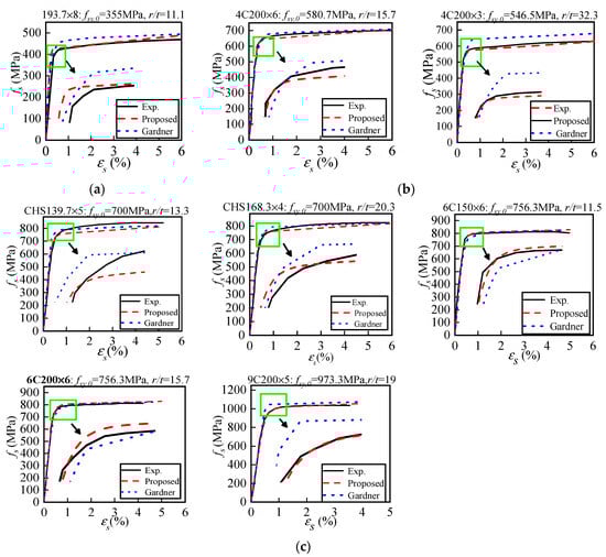 It is crucial to elucidate the difference between the stress-strain relationship prediction models. In order to evaluate the overall accuracy of the proposed model, a comparison is made between the measured stress-strain curves of tensile coupons and the corresponding calculated ones. Similarly, as a representative of existing models, the improved Ramberg-Osgood model proposed by Gardner is still being compared. Table 2 lists the main variables of the chosen specimens. As shown in Figure 13, both of the predictive models for cold-formed CHS steels have good consistency. Concretely, when fsy,0 is within 600 MPa, as shown in Figure 13a,b, the proposed model based on the Megenetto-Pinto model is almost better than the one based on the Ramberg-Osgood model. With the value of fsy,0 increasing, as shown in Figure 13c, the two models are seen to have consistent accuracy. However, it should be noted that the improved Megenetto-Pinto model proposed in the paper is directly based on the most basic design parameters, including fsy,0 and t of the parent steels and internal bending radius r, while the model proposed by Gardner needs to know the yield strength of cold-formed steel.