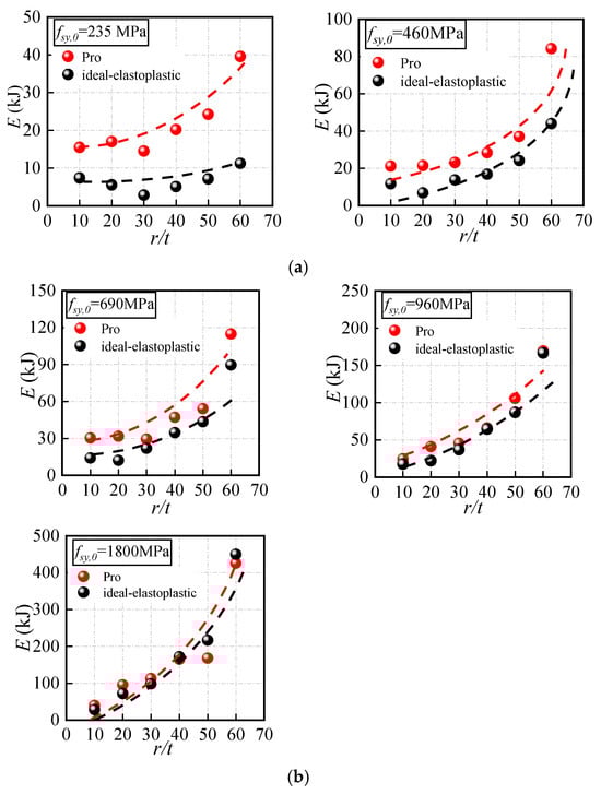 Table 3 shows the main variables of the numerical examples, in which the thickness t is 3 mm, the r/t ratio varies from 10 to 60, and the range of fsy,0 is 235 MPa to 1900 MPa. Figure 14 shows the ultimate energy absorption of the total numerical examples. It can be seen that the energy absorption is often underestimated for the specimens without considering the cold-rolling effect. For the example specimens with fsy,0 of 235 MPa shown in Figure 14a, the energy absorption capacity obtained by using the proposed model is twice that of using the ideal elastoplastic model. However, the difference in the energy absorption capacity caused by the two models decreases with fsy,0 increasing. When the value of fsy,0 is 960 MPa and the r/t ratio is about 60, the cold-rolling effect has little influence on the energy absorption. As fsy,0 reaches 1800 MPa, the influence of material models seems to disappear regardless of the value of r/t.