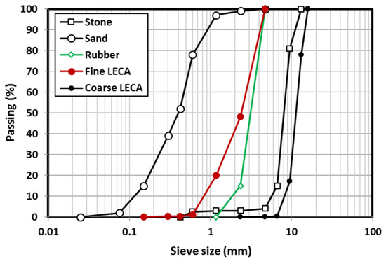 The binder materials used in this experimental study were cement, class “F” fly ash (from Fly ash Australia Pty. Ltd.), and ground granulated blast furnace slag (from Independent Cement & Lime Pty. Ltd.). The cement, fly ash, and slag had specific gravities of 3.08, 2.57, and 2.83, respectively. The selection of fly ash and slag as the geopolymer concrete binder in this study was based on the recommendation of previous studies, in which combining these two binders in geopolymer concrete afforded good performance compared with other available binders [9,24]. Table 1 shows the chemical composition of the utilized geopolymer binders. River sand and 10 mm dolomite stone were the fine and coarse aggregates used. In some mixes, fine LECA (0.3–4.75 mm) and rubber (2.36–4.75 mm) partially/fully replaced sand, and coarse LECA (9.5–16.0 mm) partially replaced dolomite stone. Figure 1 shows the particle distribution of the aggregates used. The unit weight and specific gravity were 1420 kg/m3 and 2.61, respectively, for sand; 530 kg/m3 and 0.97, respectively, for rubber; 880 kg/m3 and 1.7, respectively, for fine LECA; 1590 kg/m3 and 2.71, respectively, for dolomite; and 400 kg/m3 and 8.05, respectively, for coarse LECA. Superplasticizer with 1.085 specific gravity was used in all concrete mixes. The GC was activated using sodium silicate and sodium hydroxide (12 M) solutions that were mixed together by weight of 1.7 to 1.0, respectively, and the whole activator mixture had a specific gravity of 1.28. To ensure that it had a temperature not exceeding room temperature, the activator was prepared a day before use in concrete mixing. Two lengths (45 mm and 19 mm) of polyproline (PP) fibers with 0.91 specific gravity were used in the RECC mix.