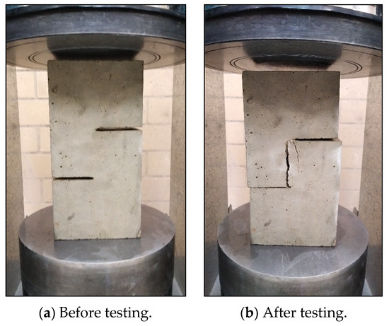 According to the Australian Standard (AS), two 100 × 200 mm cylinders and two 100 × 100 × 350 mm beams were prepared from each concrete mix for evaluating the indirect tensile strength and the 4-point bending strength, respectively, at 28 days of age. The concrete shear strength was measured by preparing two double-L specimens from each mix with external dimensions of 100 × 100 × 200 mm and testing them under axial compression at 28 days of age, as shown in Figure 2. The double-L specimens were prepared by casting full columns with 100 × 100 × 200 mm dimensions and creating reverse grooves 50 mm apart within the middle third of each specimen using a concrete saw (see Figure 2a). This resulted in a shearing area of 50 × 100 mm in each specimen. A loading rate of 0.8 kN/s was used in the indirect tensile strength test and the shear strength test, and a loading rate of 0.06 kN/s was used in the 4-point bending test.