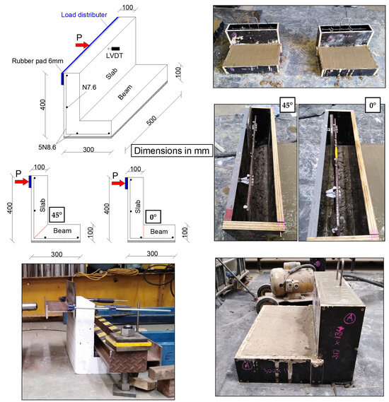 Ten L-shaped specimens were prepared for testing the reinforced concrete slab–beam joint under bending. The L-shape had dimensions of 300 × 400 mm, 500 mm width, and 100 mm thickness. Each specimen was reinforced with 5N8.6 main bars (0.58% reinforcement ratio) in the direction of the applied bending moment. Table 3 and Figure 3 show the details, geometry, and reinforcement of the tested specimens that were designed according to AS 3600 [33]. Each L-shaped (300 × 400 mm) specimen was prepared in two steps; the 400 mm part (simulating the slab needing rehabilitation), then the 300 mm part (simulating the existing beam). The 400 mm part was cast first from Eco-Con and was cured in a wooden form for 48 h. The 300 mm part was then cast from CC mix and was cured in a wooden form for another 48 h before the whole specimen was demolded and cured for 28 days by soaking in a water bath. Before soaking the whole specimen in the water bath, the concrete of each part was cured by covering it using a plastic sheet and showering in water it twice a day. The reinforced concrete slab–beam joint was tested with two angles, 0° and 45°; two similar specimens were prepared from each concrete mix, one with 0° and another with 45°. This resulted in eight L-shaped specimens for the four concrete mixes. Another two specimens were prepared to join GL and CC mixes, but with steel shear connectors. The shear connectors were 4N8 bars with a length of 160 mm and embedded vertically in one specimen with a 0° joint angle and inclined in one specimen with a 45° joint angle. The shear connectors were aligned with the geometrical centerline of the joints and embedded symmetrically around the joint interface. The concrete joint angles (0° or 45°) were considered and prepared when casting the first part of each specimen, as shown in Figure 3. Using a 100 kN capacity hydraulic jack (stroke of 300 mm), the slab–beam joints were monotonically tested with a loading rate of 5 kN/min. The specimens were fixed to the strong floor from the beam side (300 mm) using a rigid beam, as shown in Figure 3. Each specimen was instrumented with one LVDT positioned at the end of the cantilever slab mid-span to measure its deflection. A load cell with 50 kN capacity was used to measure the load on the specimens during testing. LABVIEW 8.6 [34] and a data acquisition system were employed to control and record the testing and measurements of the specimens.