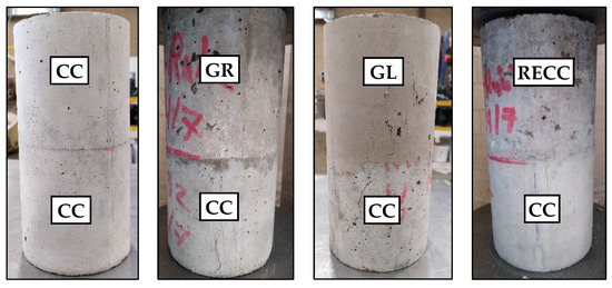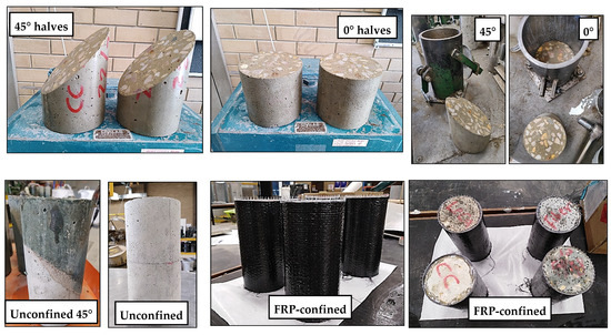 For the concrete joints in columns, unconfined and FRP-confined concrete cylinders of 100 × 200 mm were prepared for testing under axial compression, as shown in Figure 5. A total of 20 cylindrical specimens were prepared for that test, including eight unconfined specimens with a 0° concrete joint angle, eight unconfined specimens with a 45° concrete joint angle, and four FRP-confined specimens with a 45° concrete joint angle, see Table 3. The 0° joint angle was selected to simulate the typical angle in columns with repaired segments, and the 45° joint angle was selected because it applies the highest shear stresses at the joint interface’s surface. Each specimen was cast in a steel mold in the form of two halves (bottom and top). The bottom halves (simulating the existing part of the column) were all prepared from CC mix, first as full concrete cylinders that were left for 48 h to cure; then, each cylinder was cut into two halves using a concrete saw to prepare half-cylinders with 0° cuts and half-cylinders with 45° cuts. The prepared concrete half-cylinders were then placed at the bottom of steel molds and then Eco-Con concrete mixes were poured to form the top half (simulating the repaired part of the column) of the specimens and cured for another 48 h before the whole specimens were demolded and cured in a water bath for 28 days. The ends of all cylinder specimens were ground according to AS 1012.9 [35]. All specimens were tested under axial compression with a constant loading rate of 20 MPa/min using a compression machine (1500 kN capacity).