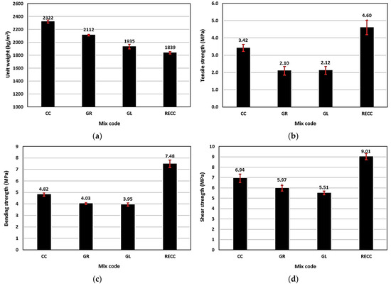Mechanical properties of the Eco-Con mixes: (a) unit weight, (b) indirect tensile strength, (c) bending strength, and (d) shear strength.