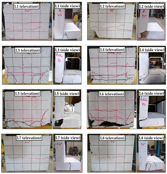At a 45° joint angle, specimens L2, L4, L6, and L8 resisted loads until crack formation occurred in the slabs at about 14 kN load and 3.0 mm deflection for L2, 13 kN load and 1.2 mm deflection for L4, 8 kN load and 0.5 mm deflection for L6, and 10 kN load and 0.8 mm deflection for L8. This was followed by a reduction in the specimens’ stiffness, and they resisted more loads until the deflections approached about 12.6 mm at a peak load of 28.3 kN for L2, 15.9 mm at a peak load of 26.9 kN for L4, 15.2 mm at a peak load of 26.3 kN for L6, and 20.2 mm at a peak load of 28.0 kN for L8. The complete failure of the specimens occurred at 22.6 kN load and 21.0 mm deflection for L2, 21.5 kN load and 27.9 mm deflection for L4, 21.1 kN load and 30.6 mm deflection for L6, and 22.4 kN load and 28.8 mm deflection for L8. Compared with all specimens produced with a 45° joint angle and no shear connectors, specimen L2 showed relatively steep load degradation after reaching its peak load, as shown in Figure 9b.