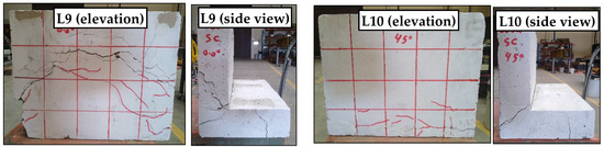 The effect of using steel shear connectors in the slab–beam joints was measured in specimens L9 (0° joint angle) and L10 (45° joint angle) made of a GL concrete slab and CC concrete beam. Figure 8c shows the performance of these specimens compared with the performances of the corresponding specimens (L5 and L6) with no shear connectors. As shown in the figure, regardless of the value of the joint angle, using shear connectors did not have any significant effect on the specimen strength capacity, as the reported strength difference was ±4%. This was attributed to the failure mode of the specimens, which was more bending failure, rather than shear failure, which depended mainly on the specimens’ main reinforcement (see Figure 7). It should be noted that the shear connectors were aligned with the geometrical centerlines of the joints and did not contribute well to the tension capacity of the joint. On the other hand, the existence of the shear connectors over-reinforced the specimens at the joint locations which increased their stiffness; hence, relatively lower ultimate deflection capacities were observed. Specimens L9 and L10 showed ultimate deflections that were 28% and 34% lower than those of the corresponding specimens L5 and L6, respectively.