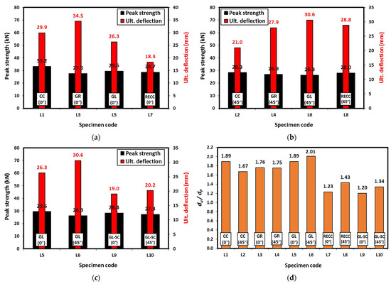 Measurements of the slab–beam joints subjected to bending: (a) specimens with 0° joint angle, (b) specimens with 45° joint angle, (c) specimens with shear connectors, and (d) du/dp ratios for all specimens.