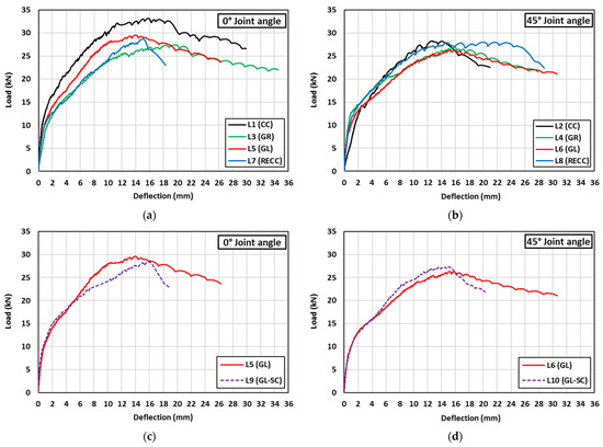 Load-deflection behavior of the tested slab-beam joints under bending: (a) specimens with 0° joint angle and no SC, (b) specimens with 45° joint angle and no SC, (c) specimens with 0° joint angle and SC, and (d) specimens with 45° joint angle and SC.